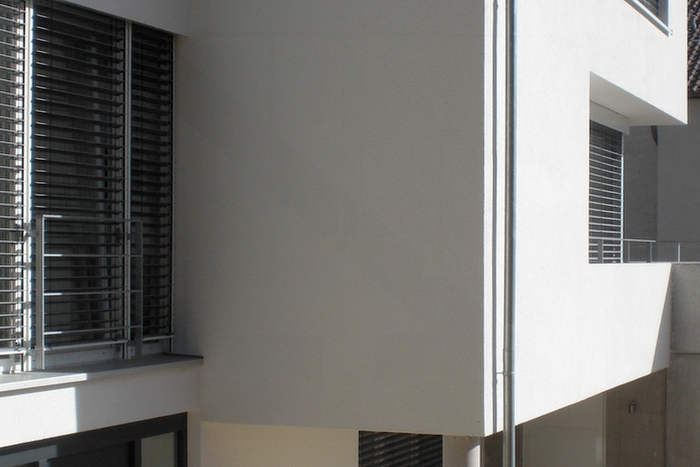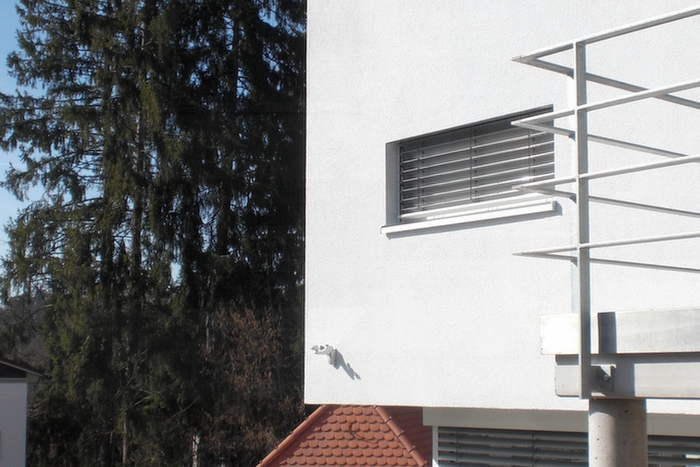 Der felsige Untergrund zwang dazu, einen kubischen Baukörper sanft auf den Hang aufzusetzen. Alle Räume des Hauses haben den Anspruch, ein Stück vom Panorama abzubekommen, weshalb sich der weiße Hauptbau wie ein Fernrohr gen Westen Richtung Schloss und der Abendsonne orientiert.