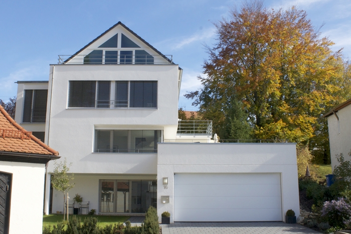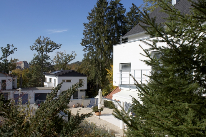 Vis-a-vis mit dem Schloss. Ein Grundstück, von welchen es in Sigmaringen nicht viele gibt. Die Reichweite zur Donau, der alte Baumbestand sowie der Blick auf das Schloss erlegten dem Planer eine hohe Bürde auf, alle Vorzüge dieses Fleckchens auch mit entsprechender Architektur zu würdigen.